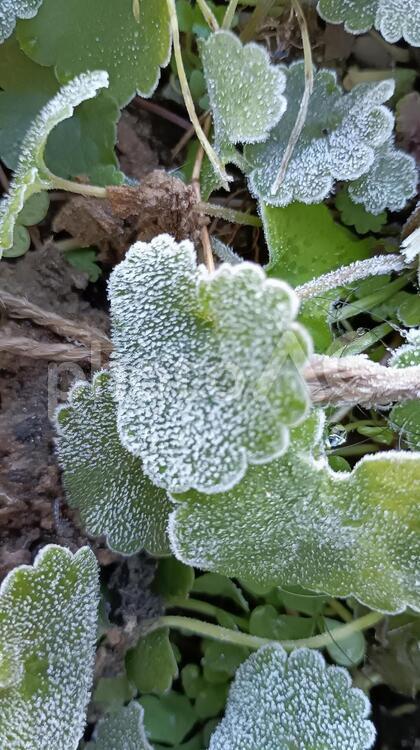 冬の寒い朝・霜に覆われたいちごの葉